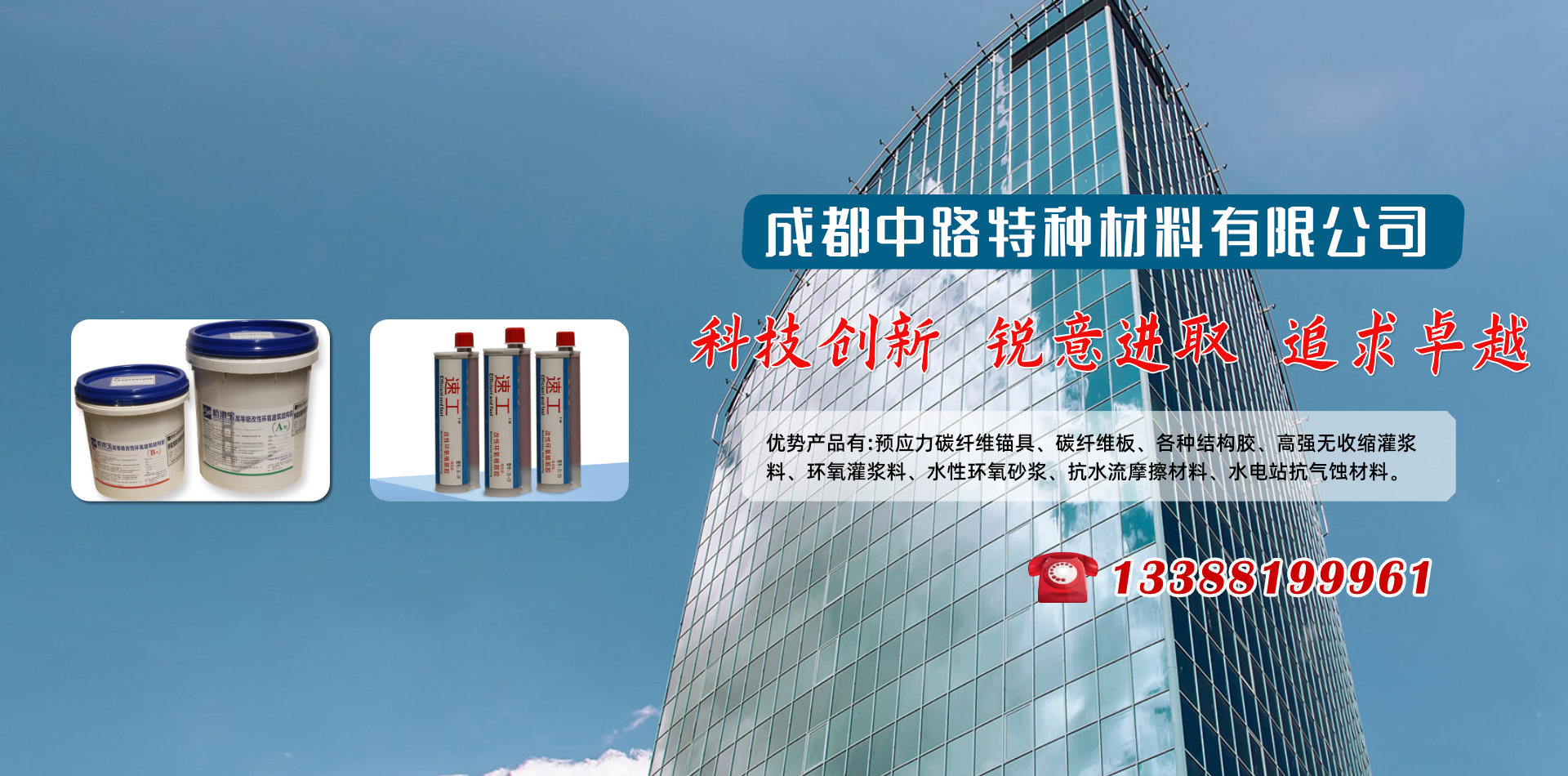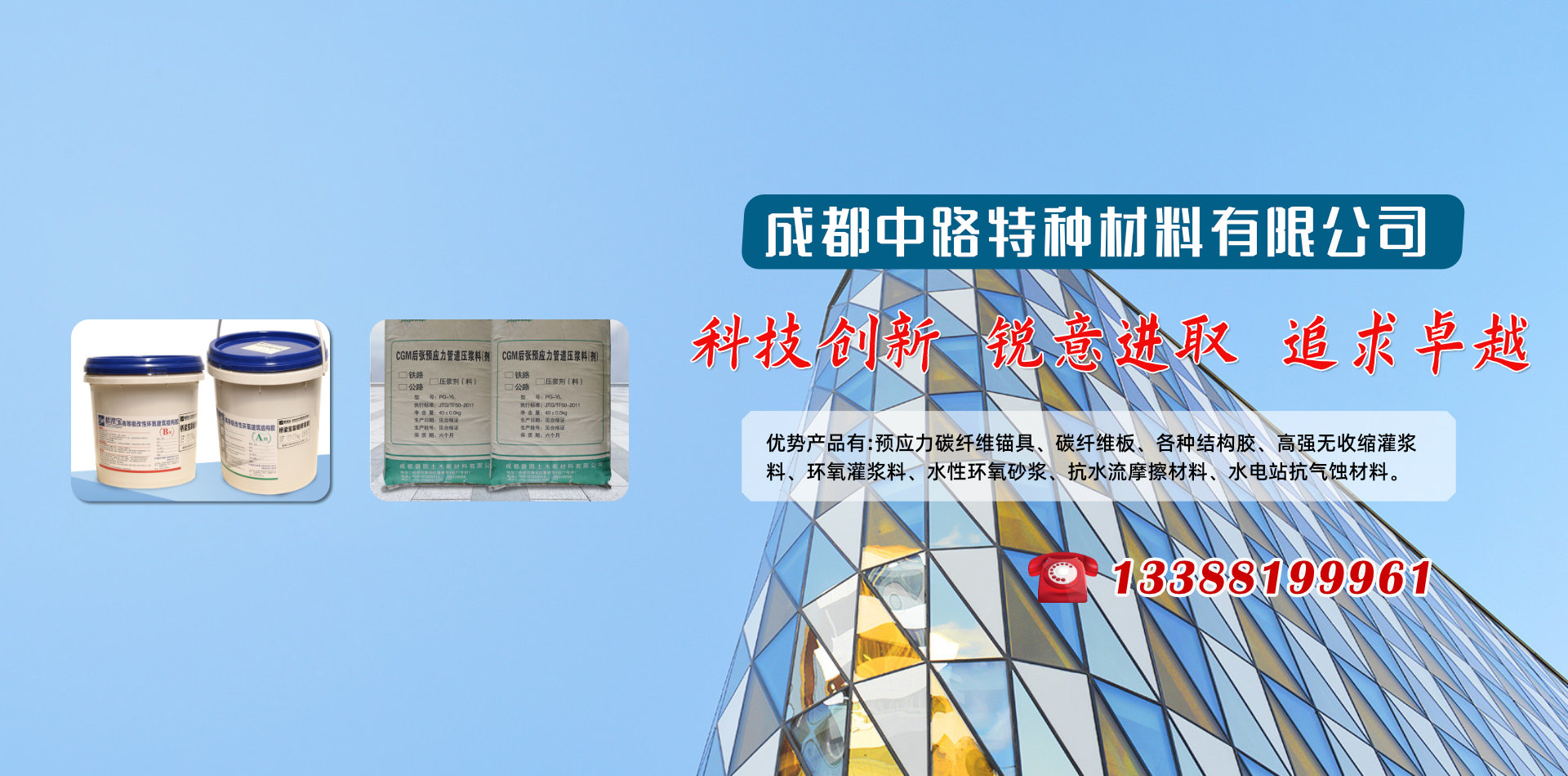 成都中路特種材料有限公司借助清華大學(xué)高分子材料學(xué)科、晨光化工研究院、西南交通大學(xué)、四川交通職業(yè)技術(shù)學(xué)院科研技術(shù)平臺(tái)成為一家集新材料研發(fā)、銷(xiāo)售、技術(shù)服務(wù)和施工于一體的專(zhuān)業(yè)服務(wù)公司,優(yōu)勢(shì)產(chǎn)品有:預(yù)應(yīng)力碳纖維錨具、碳纖維板、各種結(jié)構(gòu)膠、高強(qiáng)無(wú)收縮灌漿料、環(huán)氧灌漿料、水性環(huán)氧砂漿、抗水流摩擦材料、水電站抗氣蝕材料和研發(fā)各種特殊用途膠黏劑產(chǎn)品地處西南腹地成都,業(yè)務(wù)覆蓋四川各大中小城市、重慶、云南、昆明、新疆、西藏等區(qū)域。產(chǎn)品涵蓋各種加固施工材料、施工設(shè)備及施工配件,品牌有威士邦等aa進(jìn)口品牌,同時(shí)批發(fā)銷(xiāo)售國(guó)產(chǎn)高、中、低端品牌,為客戶(hù)提供全面參考。 成都中路特種材料有限公司為您提供加固行業(yè)的一站式服務(wù)! 如果您面對(duì)建筑物加固,不知如何下手,我們將針對(duì)您的項(xiàng)目情況,提供全面的技術(shù)指導(dǎo)咨詢(xún),甚至為您量身定做加固方案;如果您面對(duì)項(xiàng)目要求,不知如何購(gòu)買(mǎi)加固材料,我們將根據(jù)您的需要,提供多種參考,從進(jìn)口品牌、國(guó)內(nèi)知名品牌到低端產(chǎn)品,一應(yīng)俱全; 如果你萬(wàn)事俱備,不知何處尋找施工人員,我們可以為您提供具有多年加固經(jīng)驗(yàn)的專(zhuān)業(yè)隊(duì)伍;中路特種材料致力于為客戶(hù)提供全方位的建筑物加固解決方案。 成都中路特種材料有限公司是一座橋,一座連接廠(chǎng)家與用戶(hù)的橋,以質(zhì)量求生存,以信譽(yù)圖發(fā)展,成都中路特種材料有限公司期望用真摯的服務(wù)筑起一座客戶(hù)信任之橋。   科技創(chuàng)新 銳意進(jìn)取 追求卓越!        熱忱歡迎業(yè)內(nèi)專(zhuān)業(yè)人士加盟合作!